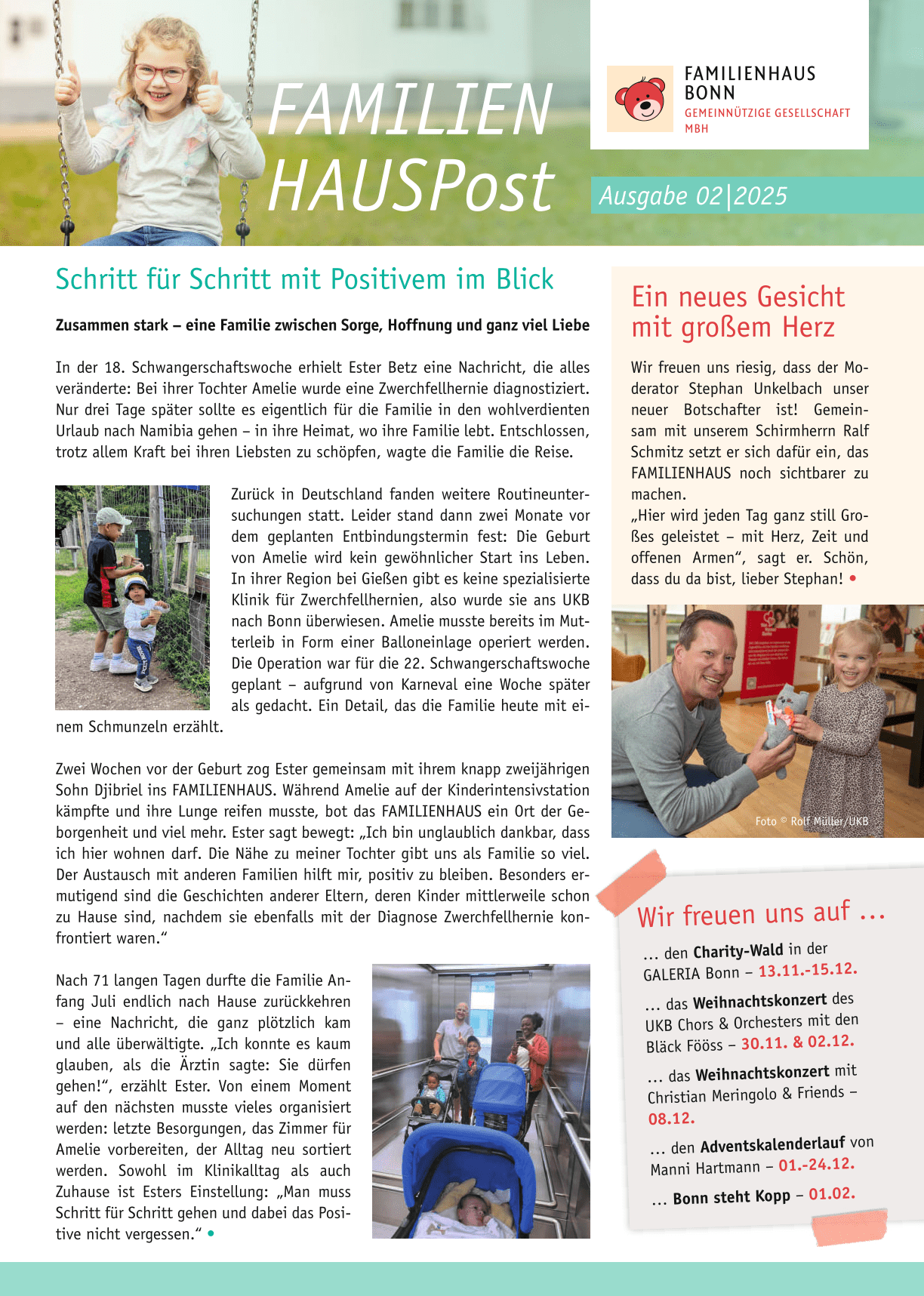 wir halten Sie auf dem laufenden FAMILIENHAUSPost Dezember 2025Momente, die bleiben – Ein Rückblick aus dem FAMILIENHAUS FAMILIENHAUSPost Juli 2025Ein kleiner Einblick in unsere Neuigkeiten aus dem letzten Halbjahr Flyer Familienhaus 2025Die wichtigsten Informationen auf einen Blick! FAMILIENHAUSPost Juli 2024Unsere neue FamilienhausPost ist da! FAMILIENHAUSPost Nov. 2023Endlich hat das Familienhaus die Türen geöffnet - Ein starker Partner an unserer Seite - Patenschaften - Spendennews FamilieNHAUSPOST Dez. 2024Die neue FamilienhausPost 02/2024